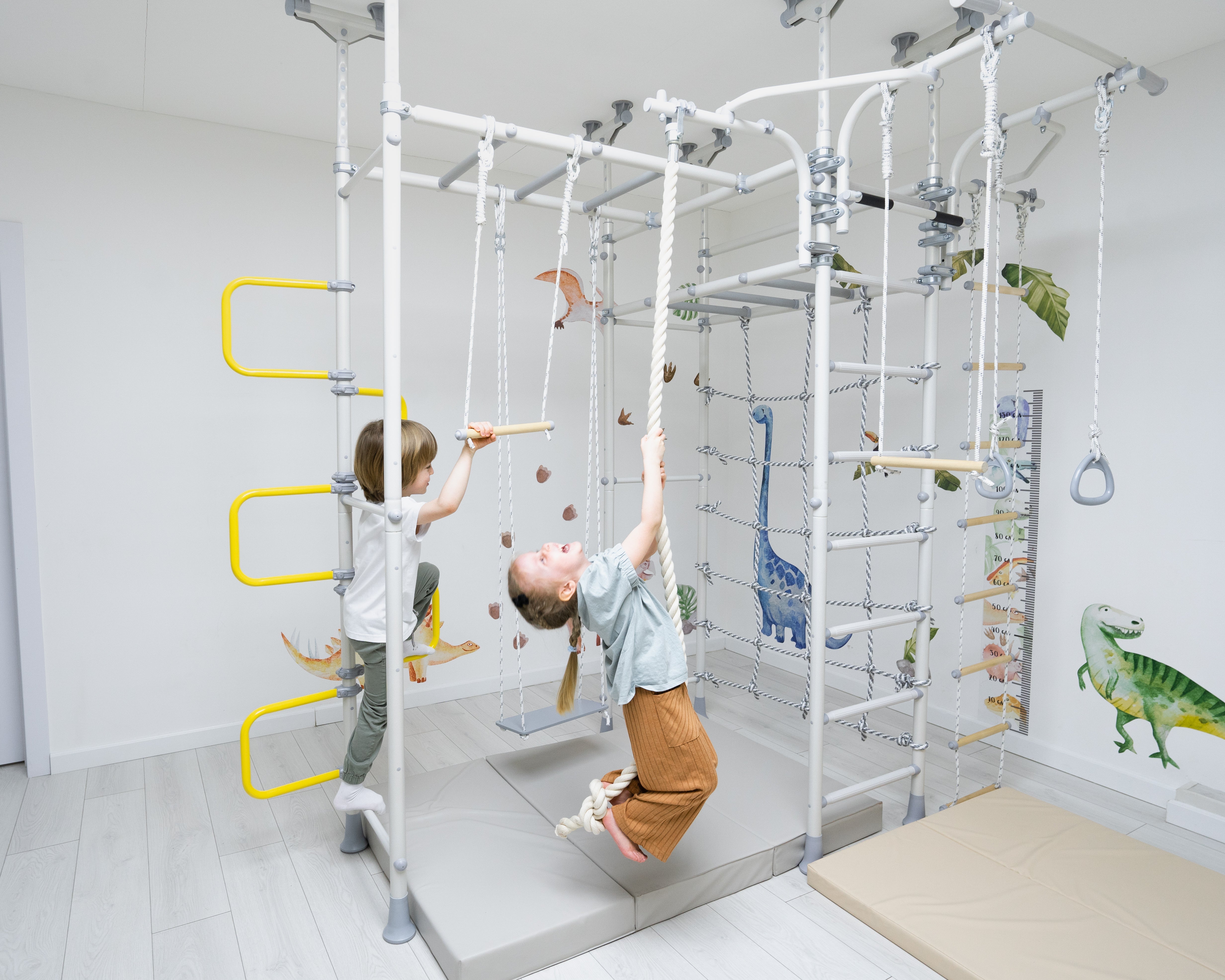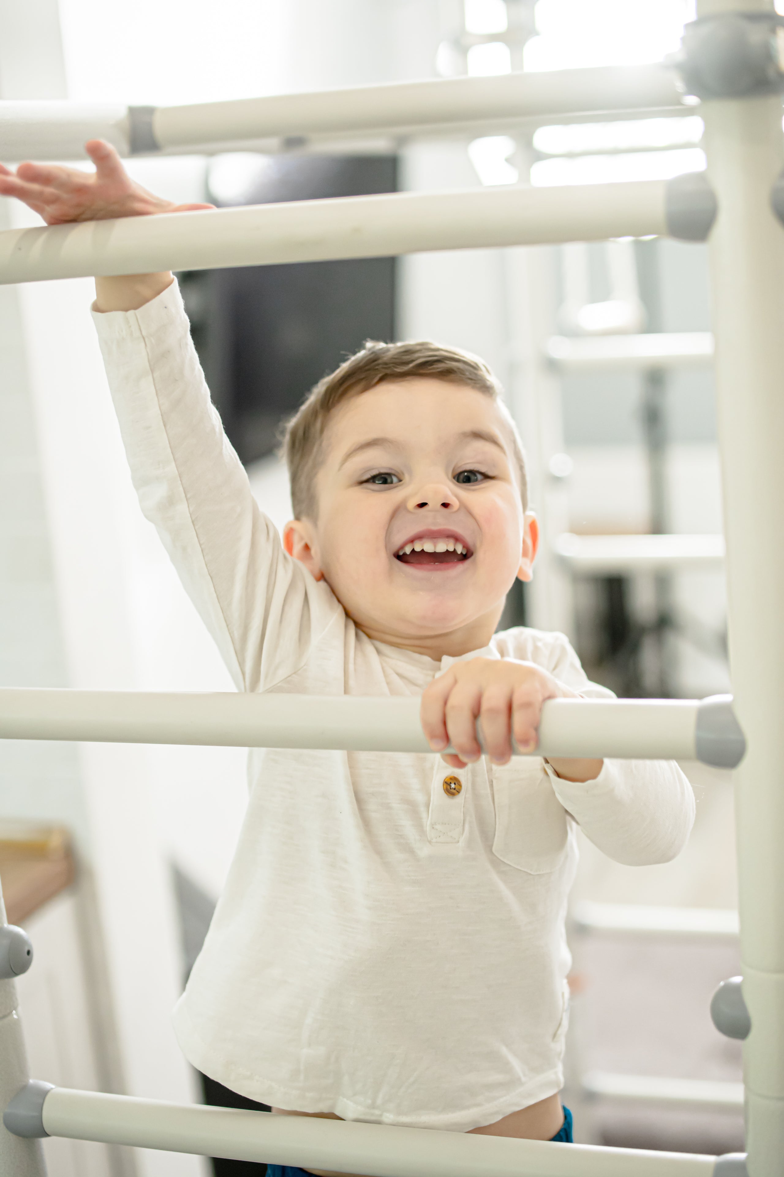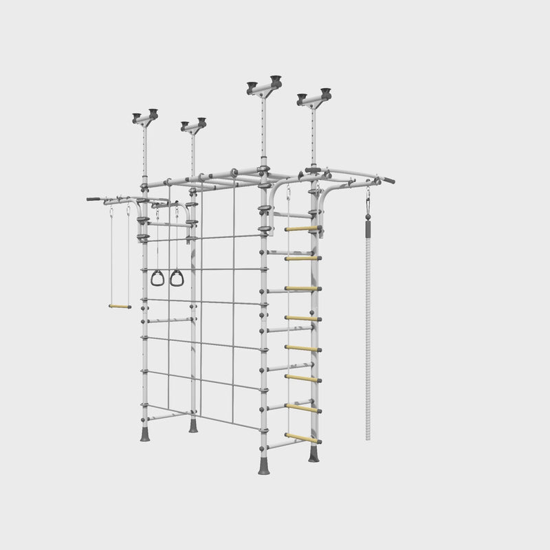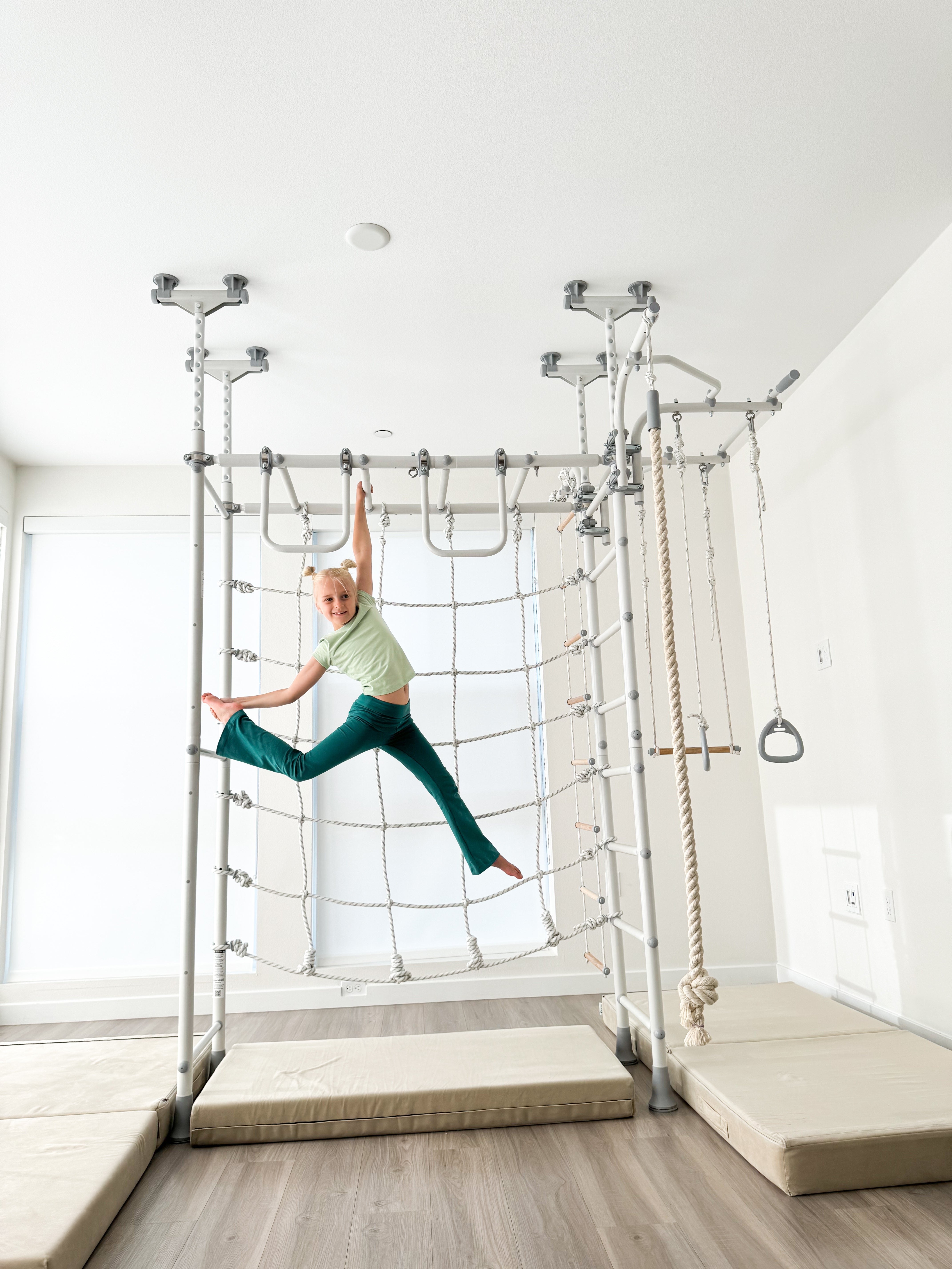 Our tension-mounted / pressure-fitted play gyms are built like LEGOs. You can always start with a smaller model that comfortably fits your space and then expand later.